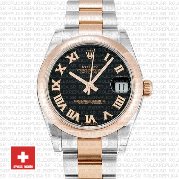Rolex Datejust 31mm Oyster 2-tone 18k Rose Gold/904L Steel Smooth Bezel Black Dial Roman Markers 178241 Swiss Replica Watch