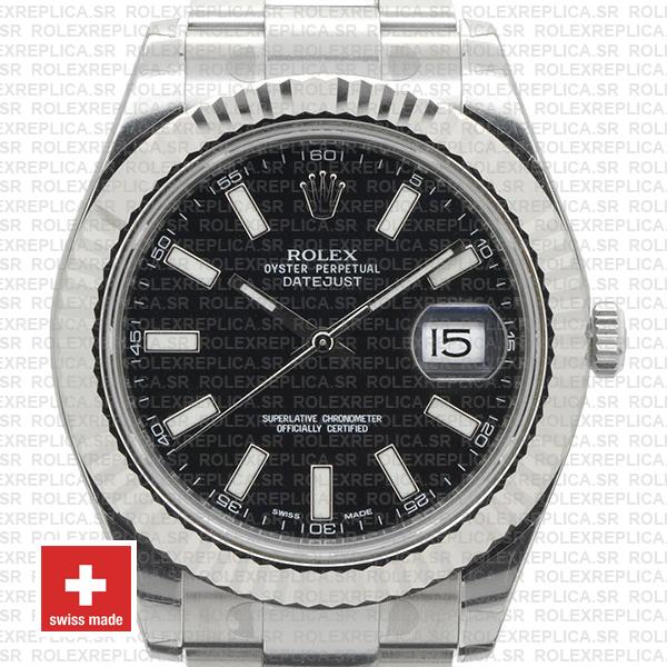 Rolex Datejust ΙΙ Oyster Black Dial Stick Markers 904L Steel 18k White Gold Fluted Bezel 41mm Swiss Replica Watch
